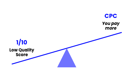 An example that illustrates Google's behavior: 2 competitors invest 12,000€/year, the first one has a Quality Score 6/10 and gets 12,000 clicks per ad. The second one with a Quality Score of 2/10 would be paying +150% extra cost per click compared to the first one, which means that he would only get 8,000 clicks with the same budget.